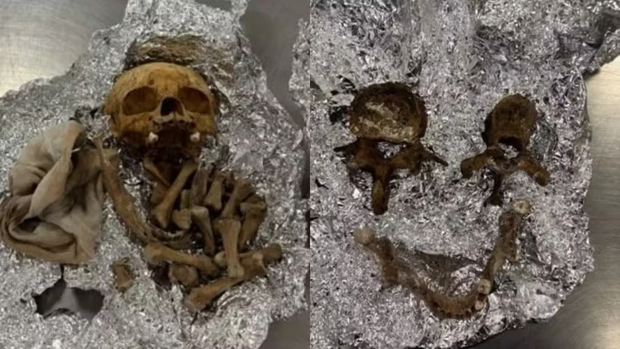 “Especialistas encontraram plantas proibidas, charutos não declarados e uma bolsa de viagem embrulhada em papel alumínio contendo o que parecia ser restos humanos, incluindo parte de um crânio.”