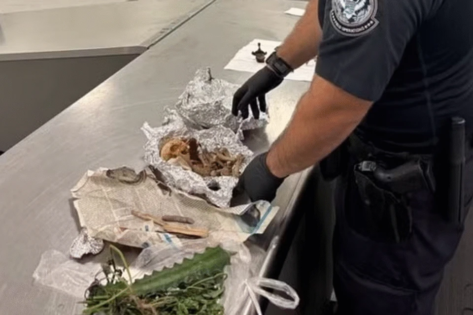 Segundo a alfândega, o passageiro havia declarado apenas dez charutos. Porém, durante a inspeção, agentes encontraram um crânio e ossos enrolados em papel alumínio, além de plantas proibidas.